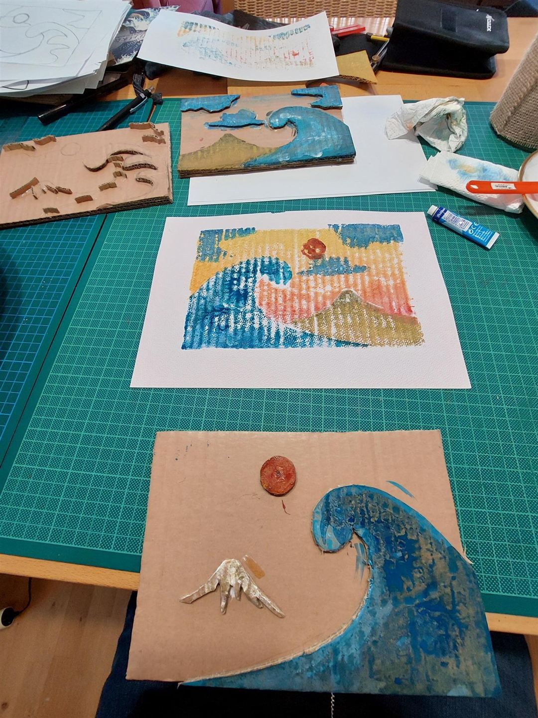 In diesem Workshop lernst du die japanische Drucktechnik Ukiyo-e kennen – eine traditionelle Methode, bei der Schichten übereinander gelegt werden. Du lernst, wie du dich mit recycelten Materialien künstlerisch in dieser Technik ausdrücken kannst. Das Thema ist die Natur: Wellen, Meer, Berge und mehr – Motive, die in vielen berühmten japanischen Kunstwerken eine große Rolle spielen. Du wirst sehen, wie man mit wenig Material eine große Wirkung erzielen kann.